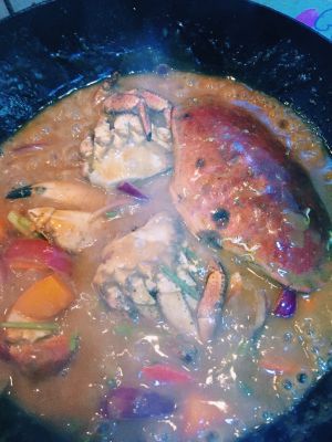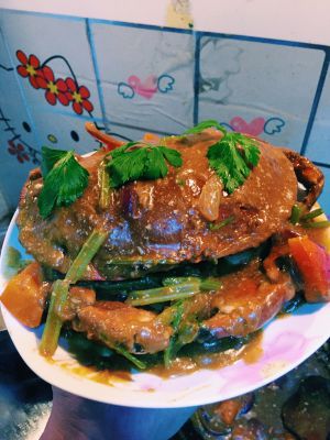 加入螃蟹和西芹炖五分钟,加入约4勺糖调味。