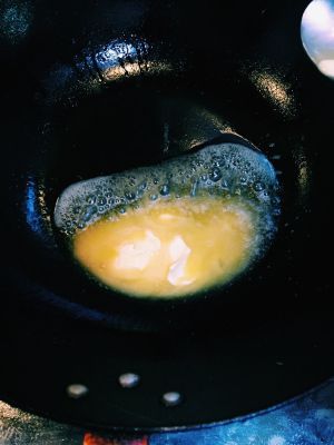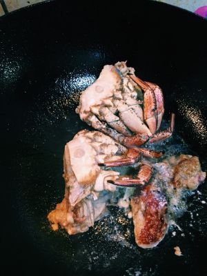 蟹的切面拍淀粉,不粘锅淋少许油炸蟹,直到切面发白。