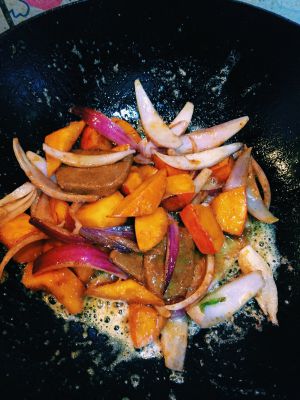 加入南瓜和洋葱煸炒半熟,加入咖喱膏炒匀。