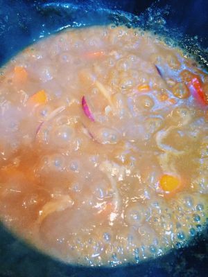 倒入椰浆,加入水调节浓稠,稍微稀一点,因为要考虑水分的挥发以及装盘后冷却造成的咖喱膏的凝固。