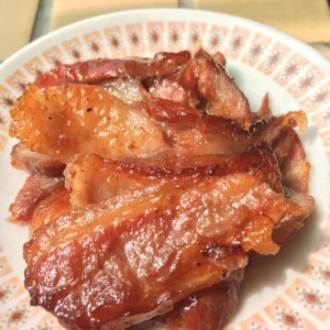 烤制的汁液喝蜜糖水一起煮开,刷在烤制完成的叉烧上。晾凉切片,大功告成。老爸说,来三大碗饭!