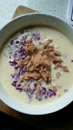 把紫甘蓝和金枪鱼放入面糊拌匀