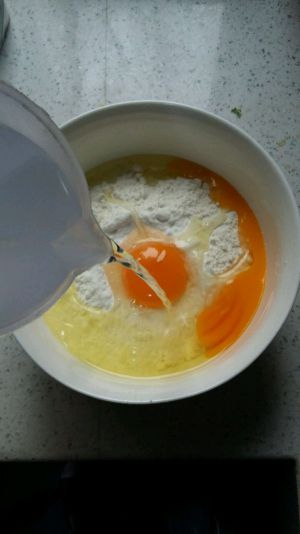 面粉放入碗里,打入两个鸡蛋,加上清水,拌匀