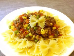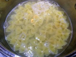 煮锅里放清水烧沸,撒少许盐,放入蝴蝶面,大火转小火煮15分钟(一般情况,意粉类的都是煮15分钟就熟了),滤水、装盘