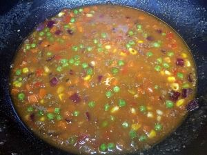 洋葱、红椒、玉米粒、番茄依次下锅翻炒,煮过的胡萝卜、豌豆和炒过的肉末下锅继续翻炒