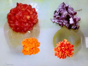 所有蔬菜洗净,番茄、胡萝卜、甜椒、洋葱切丁