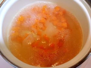 胡萝卜和豌豆先用水煮到8分熟,滤水待用