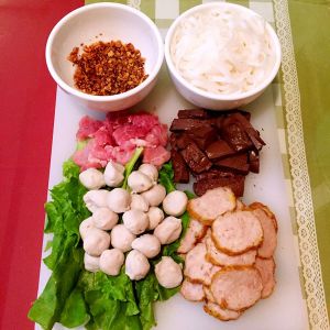 将肉丸、肉条、瘦肉、鸭血、粿条、青菜分别放入沸水中烫熟,盛碗。加入炖制好的高汤,浇上炸好的蒜蓉油,最后洒上芹菜花,一碗丰盛又美味的传统潮汕美食完成!