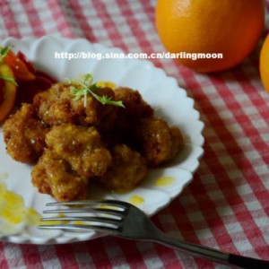 取另一只锅子,倒入鲜橙汁,小火熬至粘稠,放入鸡米花,翻炒下,裹满鲜橙汁,出锅 。
