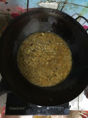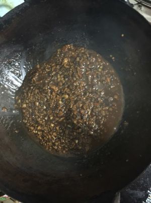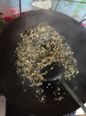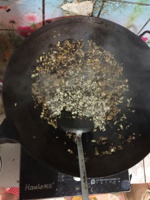 先放姜蒜末来做料头,以小火煸炒至微微金黄色,此时加入豆豉和香菇梗煸炒