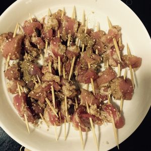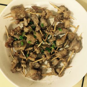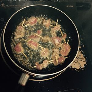 用牙签串肉串。注意,每串不要串太多肉,一块足够,肉块切成长方形。