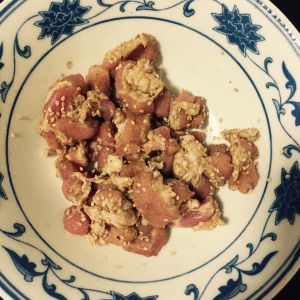五花肉切块,撒孜然粉和白芝麻,再加少许鸡精。