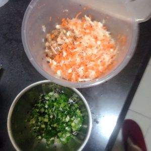 再把胡萝卜,鸡肉,金针菇葱切丁,葱切好,撒上芝麻。