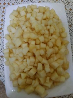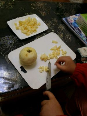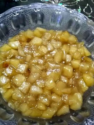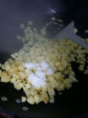 炒的时候记得加一点水,然后再把水分炒没,使苹果块儿变软变稠后加一点水淀粉勾汁即可