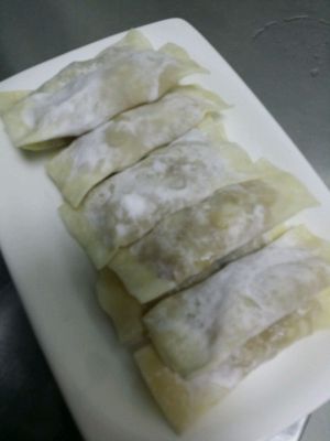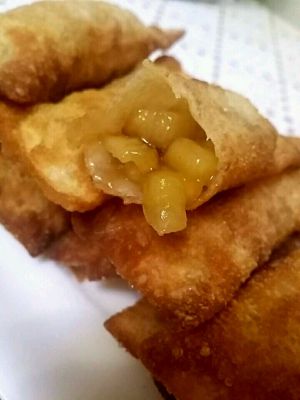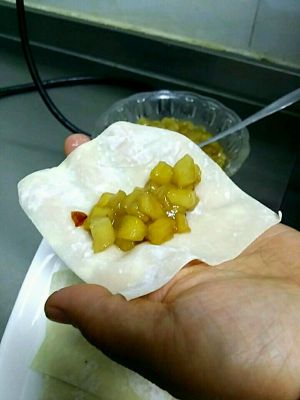 取馄饨皮把苹果馅放中间呈长方形包起,不沾的话可以沾些水就好