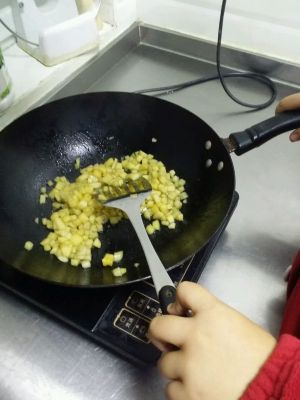 锅内放少许油烧热后放入适量白糖翻炒,直至炒软