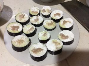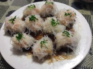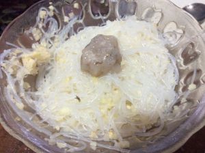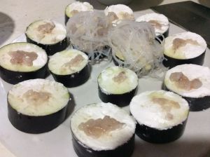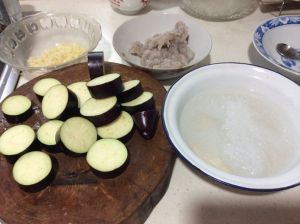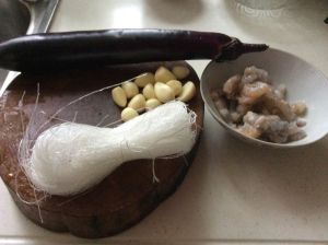 茄子切寸片,粉丝开水发,蒜头㓠成蒜蓉,虾仁切成蓉,虾蓉内加盐,胡椒粉料酒顺一方向搅拌均匀备用。