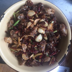 再倒油先放蒜、姜、炒出香味再放辣子和花椒,感觉刺鼻倒炸好的鸡块