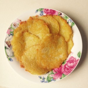 平底锅烧热放一勺菜籽油(不可取橄榄油燃点低)等油烧到7成热是取一勺土豆泥放在锅里摊平,等成型边缘微黄就可以翻一面