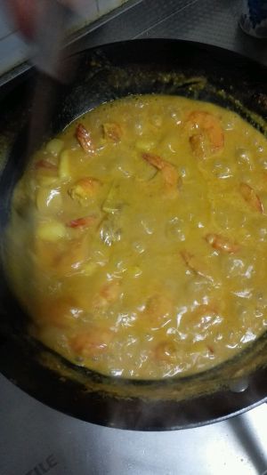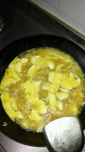 放油,蒜瓣,炒香后将土豆,杏鲍菇先后放入煸炒,变色后放入清水,烧开后放入咖喱。(根据个人口味,本人喜欢特别浓郁的,放了大约半瓶140克)