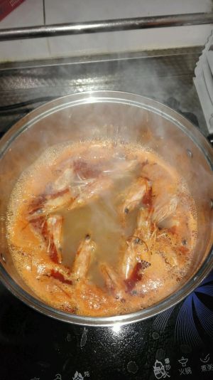 汤烧开后,将之前煎煮虾头的汤倒入。然后继续煮汤。