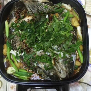 接下来就去把所有的配料放入电火锅,等烤鱼