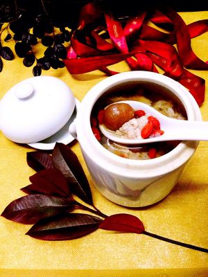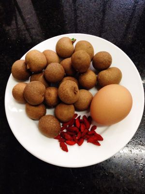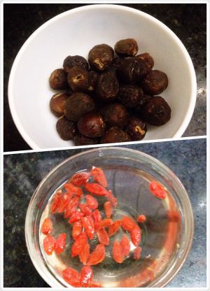 将桂圆干去壳,再用温水清洗一遍沥干水分,枸杞放入温水中泡发
