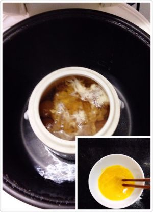 鸡蛋磕入碗里打成蛋液,之后将蛋液慢慢绕圈的倒入桂圆汤中,炖盅加盖在炖锅里再炖10分钟让蛋液凝固