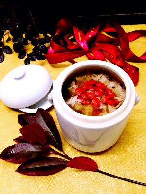 出锅后加入泡发好的枸杞,汤汁甜度适中无需加糖,这就是成品啦!