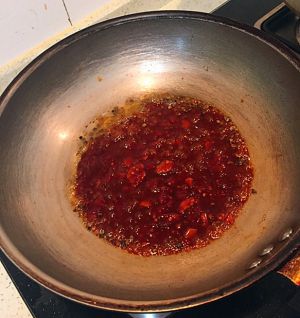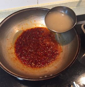 热锅凉油,下麻椒,加入调好的汁炒匀
