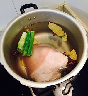 加桂皮、高良姜、大葱、姜、草豆蔻、大料、花椒、香叶、料酒,入高压锅50分钟