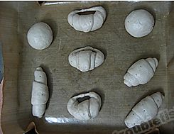 整成自己喜欢的形状。我今次参考王传仁的芒果牛角包的整形,自认擀得够长,但是卷起来还是不够。