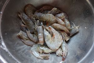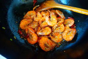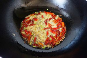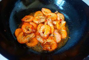 锅里烧热适量油,把腌好的虾炒红至干爽盛出。