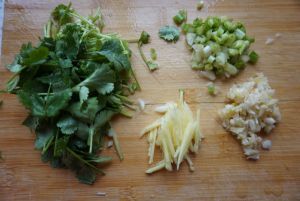 蒜切末,姜切丝,葱切碎,香菜切段。