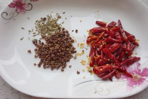干辣椒剪段,花椒、茴香籽备好。