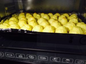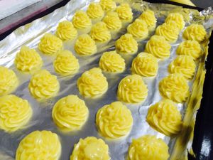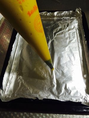 把烤盘放入预热好的210度的烤箱中,可以置于中层或中下层。烤15-20分钟,当泡芙膨胀起来了,将温度降低至180度,继续烘烤。一般还需15-20分钟,具体根据自家烤箱的功率。烤至表面金黄即可。烤的中途不可以打开烤箱。