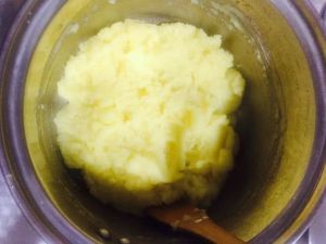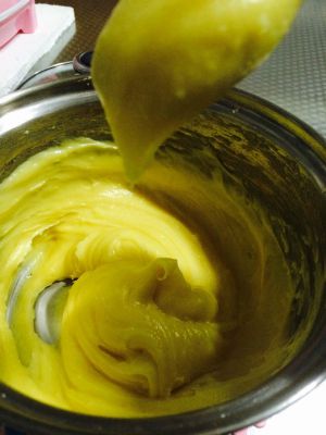 提起木勺,观察面糊形状。如果面糊呈倒三角状,并且不会滑落就OK了。不能再加入蛋液了。