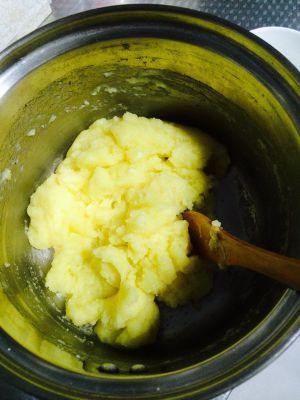完全融合后,关火取下,用木勺将其摊开散热。冷却至不烫手时,加入第一次蛋液。