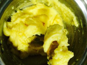 第三次加入蛋液非常重要!最后1/3蛋液,要一点一点加入,时刻观察面糊粘稠程度,面糊会越来越细滑。
