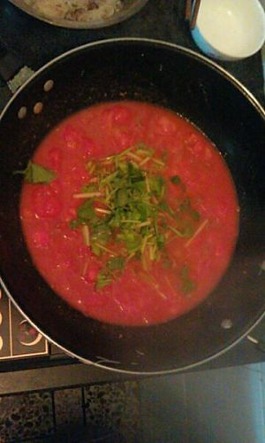先炒番茄,再下牛肉。番茄的汁泡着牛肉煮一下。然后下点糖。(妈咪说番茄酸酸的,下糖才好吃!╭(╯ε╰)╮!)