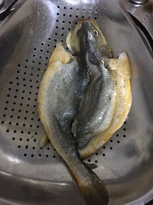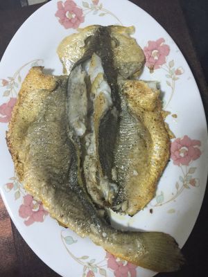 出锅,请大家忽略刀功!最后再啰嗦一句要是自己会杀鱼自己杀,从鱼背剖开这样煎出来会更好看!