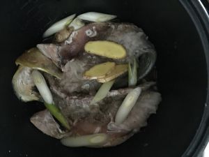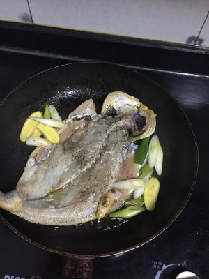 放入一点点油,以免鱼会粘住,把腌鱼用的葱姜一起放进锅里这样可以去鱼的腥!记得一定要小火慢煎,这样鱼皮也会很完整,而且不容易糊!要两面煎,翻面的时候一定要慢,不然鱼就碎了!把两面都煎得脆脆的就可以出锅了!