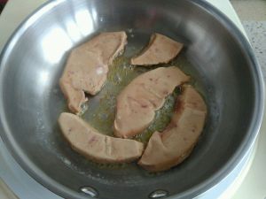 黄油至锅中融化后放鹅肝。鹅肝两面煎至1-2分钟,两面泛黄即可。