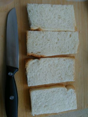 吐司片按鹅肝的大小切片儿。去掉两边的面糊边。