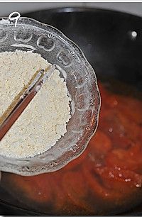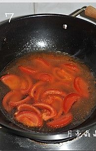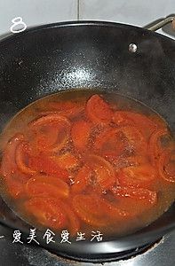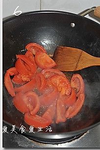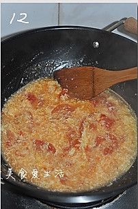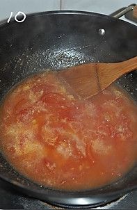 锅中放油烧热后,倒入番茄块加一点点白糖用大火爆炒,炒到番茄起糊出沙。