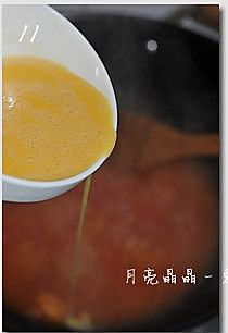保持锅中滚开状态,把蛋液由边缘往中心转圈淋入锅中,淋完立即用锅铲推开。