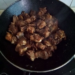 把准备好的骨头放到糖色里翻炒,加生抽,老抽,盐,葱,姜,草果,八果一起炒.