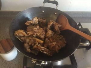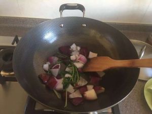 羊蝎子煮一下,洗净,把洋葱香菜拿出,再放入冰糖炒糖色,然后放入羊蝎子翻炒5分钟