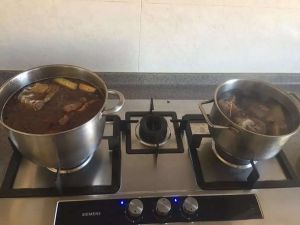 炒锅中加料酒,老抽,生抽,水,料包炖,我是又做了一锅麻辣的所以分两个锅炖,炖2个小时左右