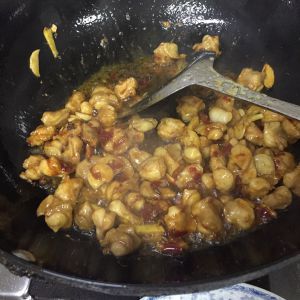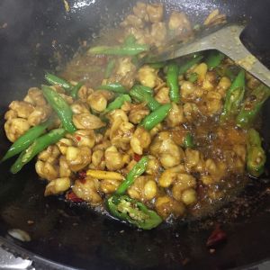 3、热锅下油,油热后放入鸡脆骨爆炒,下姜蒜花椒爆香后加入郫县豆瓣,炒制肉香。